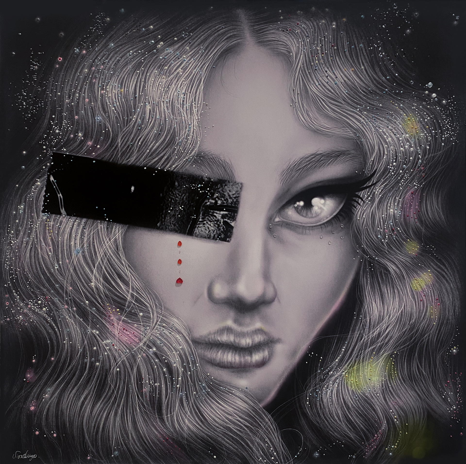 Mixed media: Acrylic, charcoal and digital graphite, spray and crystalÂ